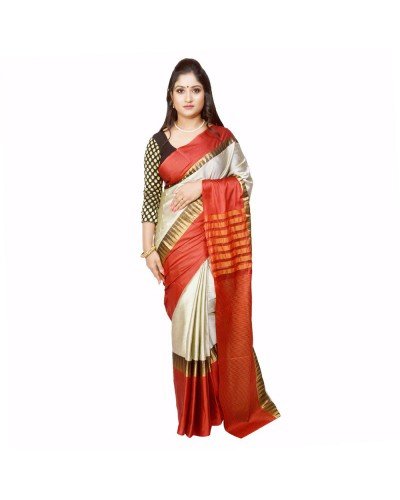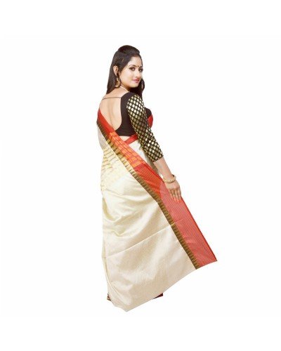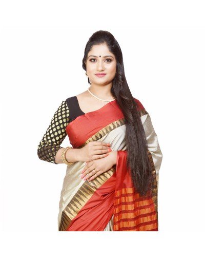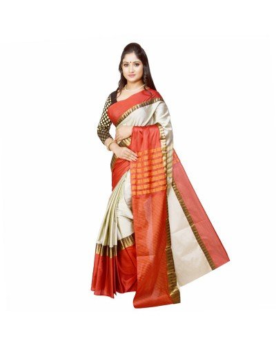 This art silk saree is patli-pallu and its colour combination makes it look eye-catchy. Along its border and pallu, the saree has golden zari woven work. Ideal to be worn for festive occasions, this saree has a beauty of its own and is sure to define a new style statement for the wearer.